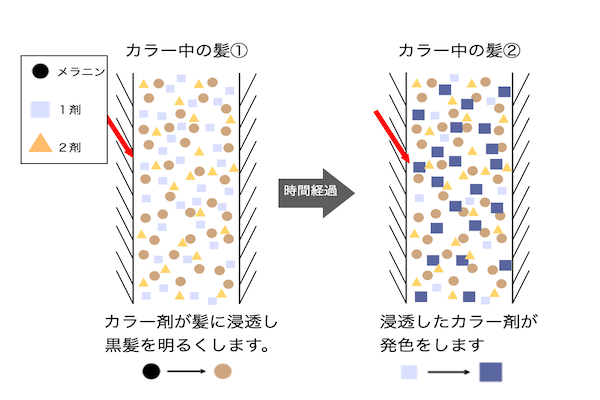 脱色と発色: 薬剤が混ざり合うと、酸素が働き始めます!同時に、あなたの自然なメラニン色素を分解して髪を明るくし、カラー剤に含まれる染料と反応して発色し、本来の色を作り出します。