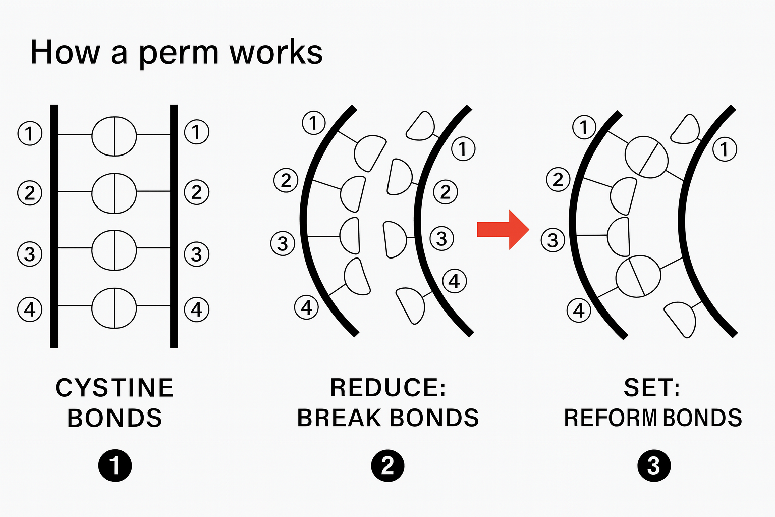 Your hair is primarily made of a protein called keratin, which has different types of bonds that give it strength and shape.The key players in perming are disulfide bonds (also called cystine bonds), salt bonds, and hydrogen bonds.